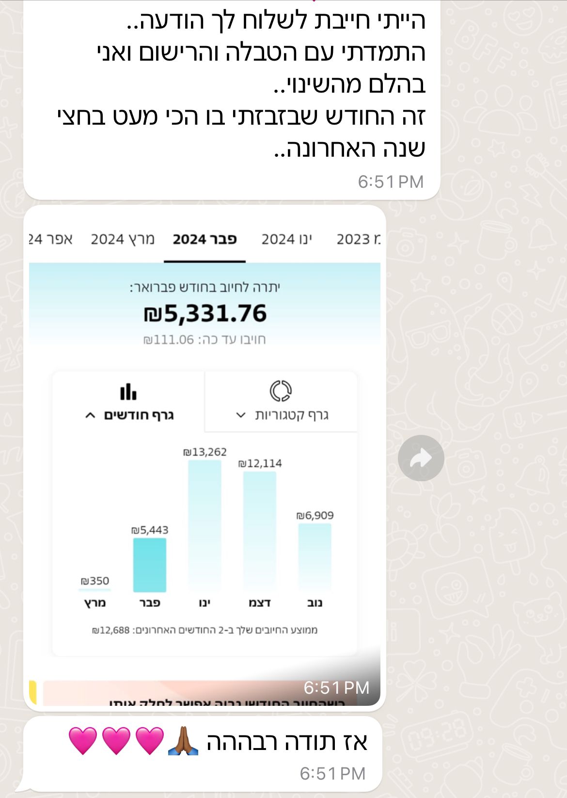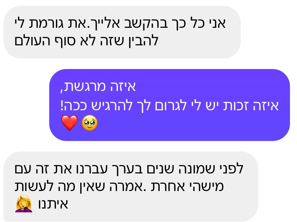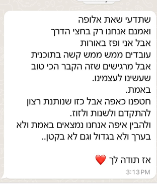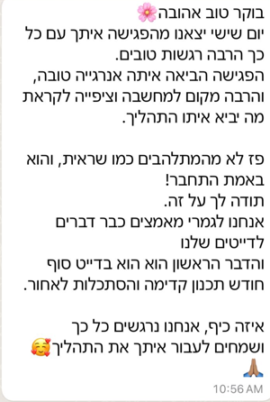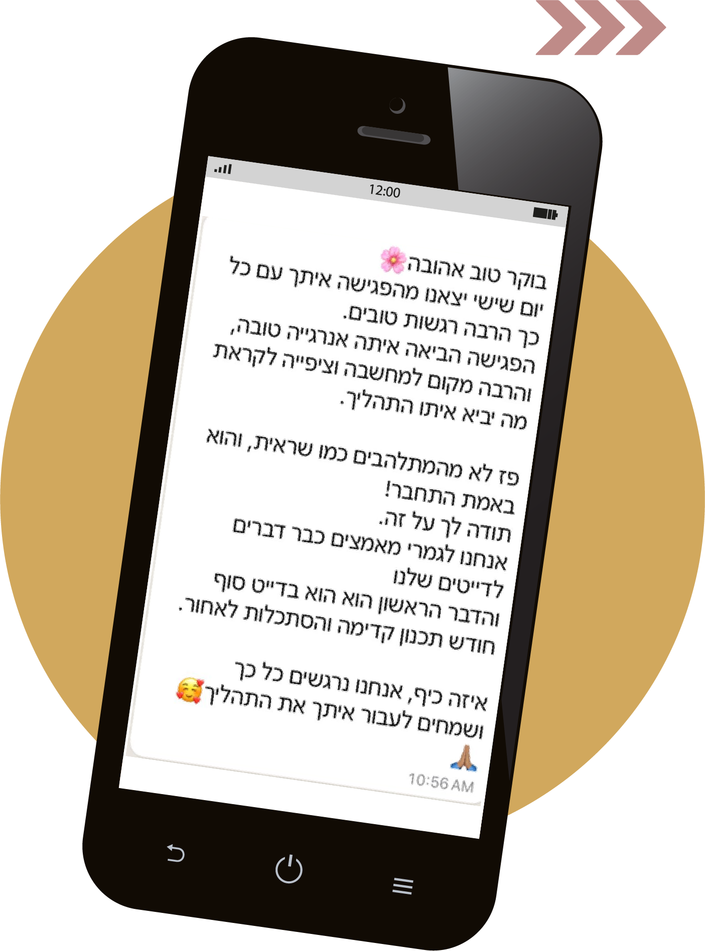 בין הפגישות אני זמינה להעניק לכם ליווי רציף בווטסאפ, במייל או בטלפון.